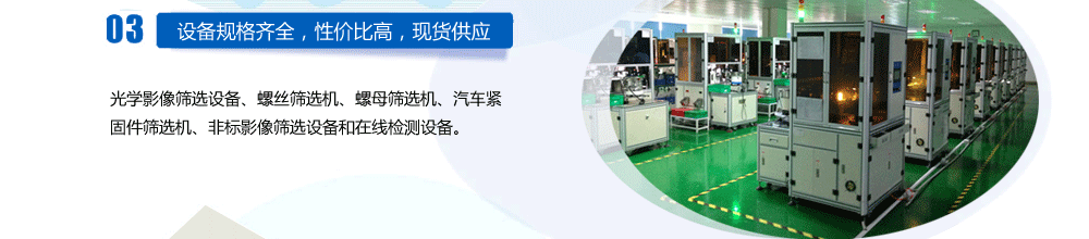 東莞市好色先生TV污智能科技有限公司是一家生產光學視覺(非接觸式)自動化檢測設備,專注於視覺、激光、光譜與渦電流自動化檢測的高新技術企業。我公司銷售已初具規模,先後在昆山、寧波、溫州、天津等地成立辦事處產品覆蓋10多個省市,並銷往東南亞一些國家和地區,同時公司計劃在歐美地區、東南亞地區、台灣地區繼續發展代理商,加快開拓海外市場。公司有多項技術都處於本領域前列。如緊固件尺寸檢測高達0.001MM,速度高達1200PCS/MIN。五金零件氣孔、砂眼、探傷、360度頭裂、連接器、蘋果手機按鍵等產品能大批自動化檢測;另外搭配激光檢測精度能達到微米(UM)水準;並在2016年成功開發了各類非標自動化設備,如稱重、記數包裝...