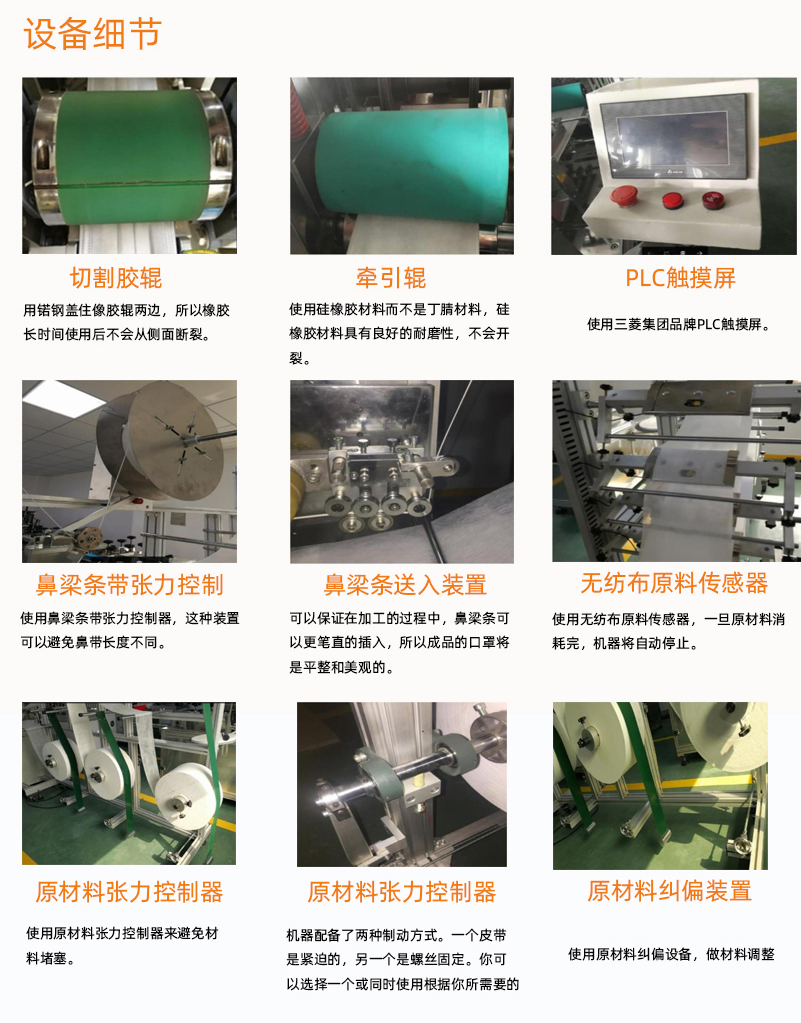 4、全自動外耳帶電焊機同時製作口罩片材和外部耳焊點部分,可節省勞動,一旦無紡布原材料在使用的過程中使用完,機器會自動停止。
