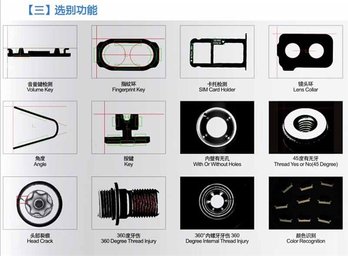 可以檢測螺絲、螺釘、螺母、異形五金、電子產品、航空緊固件、汽車配件、手機零件、手機殼、橡膠件、精密車削件、塑料件等。